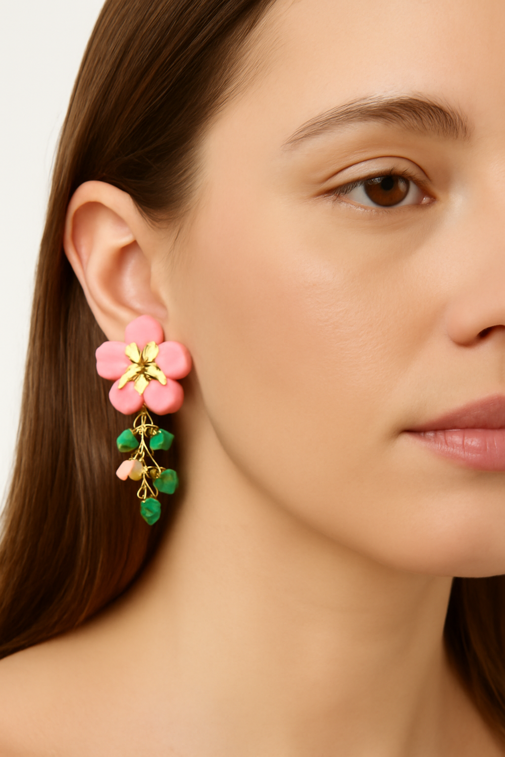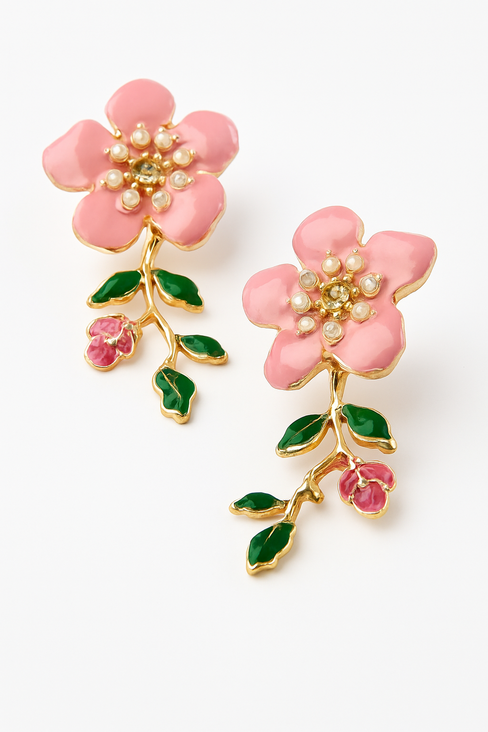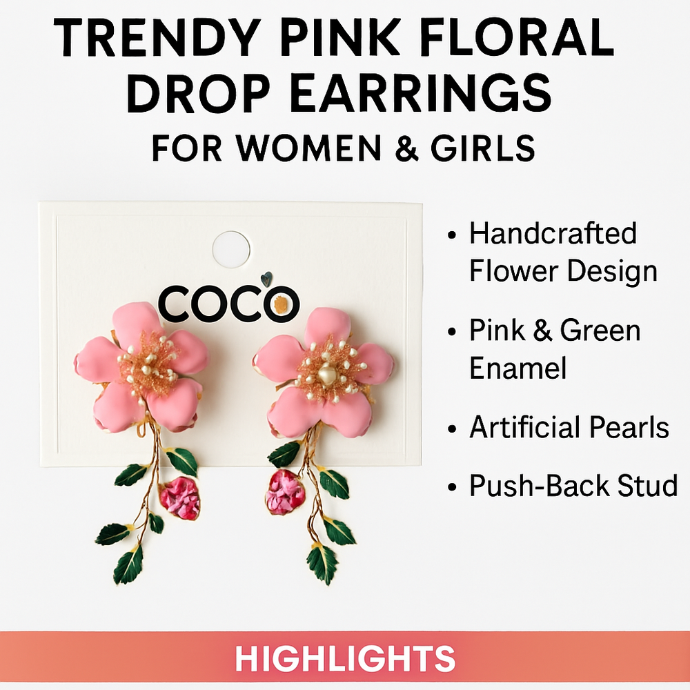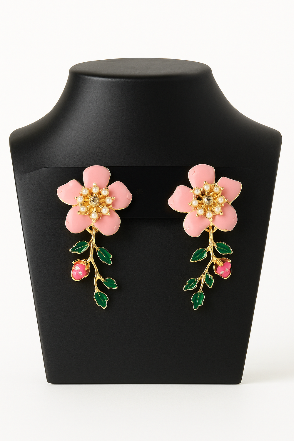 Elevate your style with these elegant pink floral drop earrings. Featuring a bold, handcrafted flower design with enamel finish and delicate hanging buds and leaves, these earrings blend traditional charm with modern appeal.